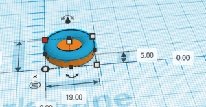 - You now have a base! Next we want to add a curved lip to the top of the base. To do this, click and drag a blue torus onto your workplane. Change the length and width of the torus to match the cylinder (19×19) and keep the height at 5mm. Place it in the corner by changing the green distances to 0. Your pieces should now overlap as follows: