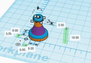 - To get exact measurements in Tinkercad, it is easier to use the measurement numbers. For this pawn, we want to change the base so that it is 19mm wide, by 19mm long, by 3mm tall. Your plane should now look as follows: